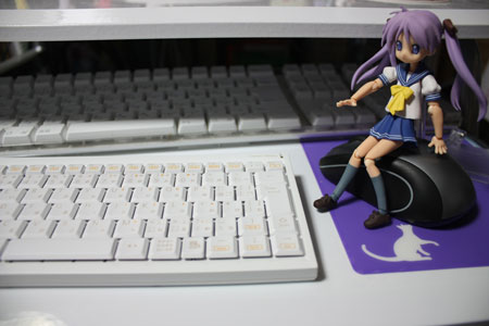 幅の狭いパソデスクのスライドキーボードテーブルの上に、マウスとトラックボールと一緒に並べられるのと、切り替えでマックんと窓機の両方で使うことが出来るのが便利なんですよね。