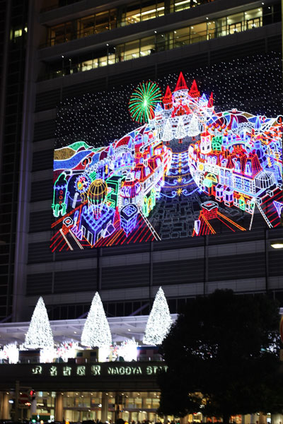 この時期、ターミナル駅では駅ビルの壁面やテラス部分などに、派手なイルミネーションを飾るんですよね。
