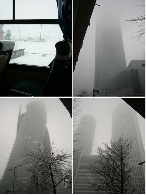 雪の降る中を街まで来るなんて、なかなか無い事ですから、雪に煙る駅前の高層ビル群(左下、右上・下)を撮ってみました。